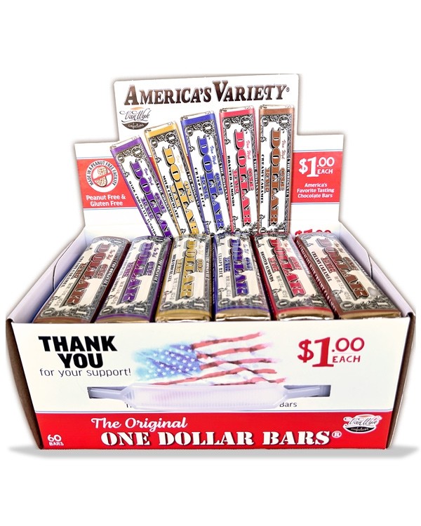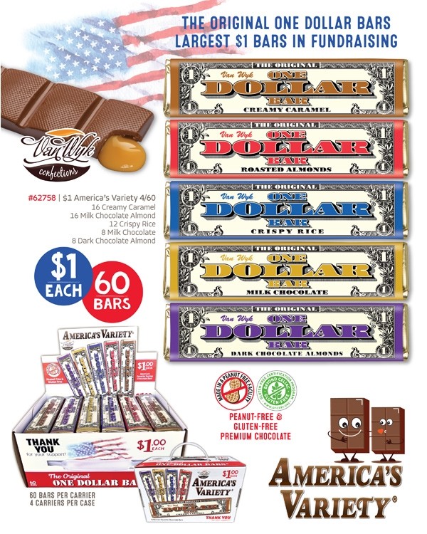 The original ONE DOLLAR BAR America’s Variety carrier is our favorite $1 candy bar fundraiser. It includes a selection of five different candy bars, including the popular milk chocolate almond bars and crispy rice! Order as little as 1 case at a time and get free shipping.