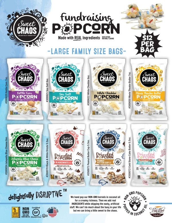 The Sweet Chaos Gourmet Popcorn Fundraising Program! Did you know that we Americans consume more than 17.3 billion quarts of popcorn each year? We think the new Sweet Chaos gourmet popcorn will boost the popcorn frenzy even more! How? Well our Sweet Chaos non-GMO kernels are hand-popped in coconut oil to give them a creamy richness, making their taste simply irresistible and setting them apart from the rest! Every bite of our Gourmet Popcorn is crisp, flavorful, and fresh. And each of our 8 fun and fantastic ready-to-eat flavors come in a sealed bag providing a shelf-life of 6-9 months, depending on the flavor. Sea salt, peanut butter cup drizzle, Cold Stone cake batter - what do you think your best-seller will be?! At only $12 per bag for a family-sized bag, your fundraiser is sure to be success, no matter which is your best -selling flavor! Let's get your gourmet popcorn fundraiser started today.