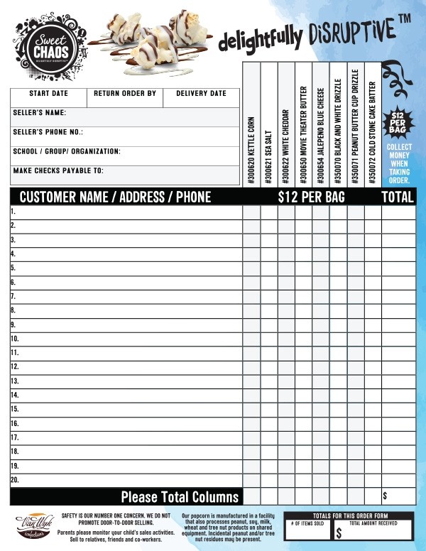 1) Order Your Free Sweet Chaos Popcorn Order-Takers. We will mail out your popcorn order-takers, and create your group's custom online store. We will email you a link so you can share the store with your group members and parents.