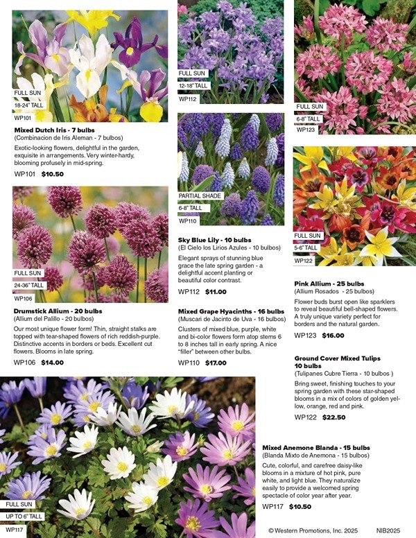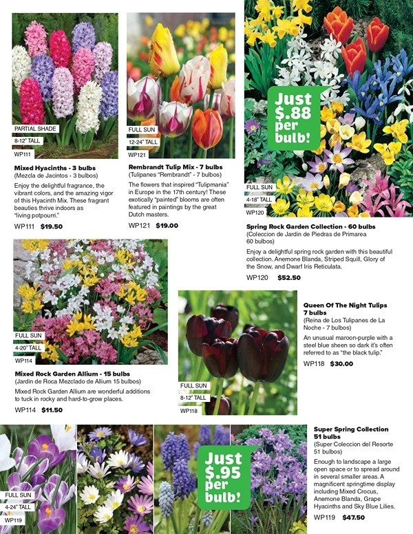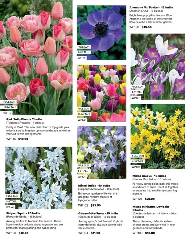 Mixed Crocus, Mixed Tulips, Anemone Mr. Fokker, Glory-of-the-Snow, Cool Blue Collection, Mixed Daffodils, Paperwhite Narcissus, Mixed Hyacinths, Allium Giant, Mixed Rock Garden Allium, Pink Tulip Blend, Super Spring Collection, Spring Rock Garden Collection, Rembrandt Tulip Mix, Ground Cover Mixed Tulips, Striped Squill, Queen Of The Night Tulips.