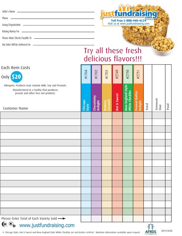 The Gourmet Caramel Corn Fundraising Program! Did you know that we Americans consume more than 17.3 billion quarts of popcorn each year? Every bite of our Gourmet Caramel Corn is crisp, flavorful, and fresh. Offer your supporters six fantastic flavors and watch your fundraising profits explode! This product is Kosher. Has a shelf Life of 120 days, No artificial additives, preservatives or fillers. Zero Trans Fat.