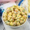 "The irresistible flavor of Bir thday Cake Popcorn is swirled with a white chocolatey coating and birthday cake flavor. Then we tossed all that bir thday cake goodnesswith sweet, colorful sprinkles. It’s like a surprise party in your mouth."