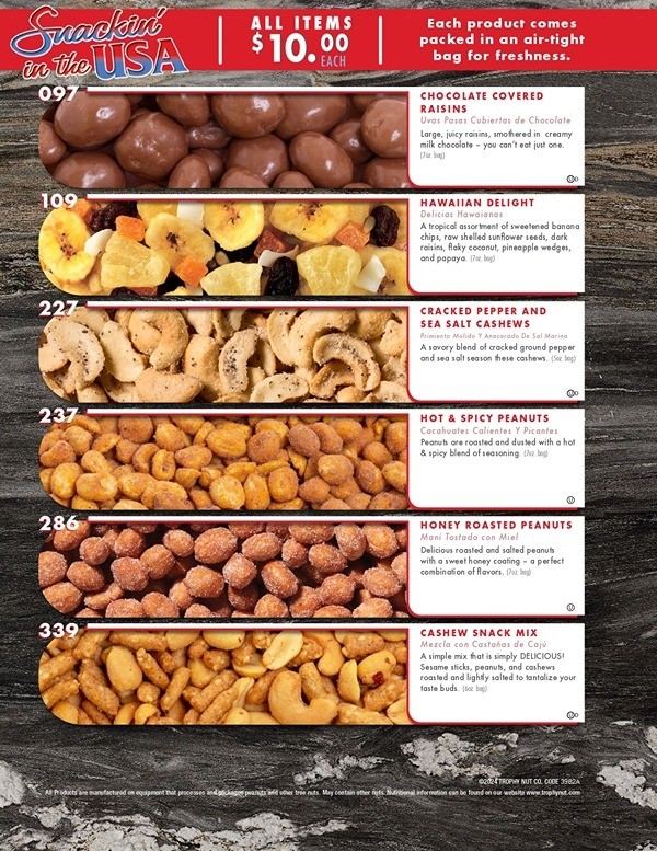 • Sweet N’ Crunchy Trail Mix: Peanuts, raisins, choc-o-buttons, honey-roasted peanuts, almonds, and sunflower seeds.